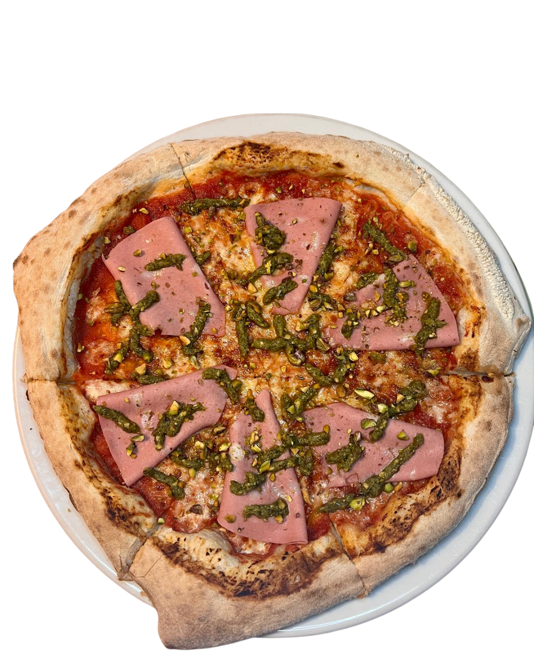 Provola *sos z pomidorów włoskich, mozzarella fior di latte, mortadela, paesto bazyliowe, pistacje